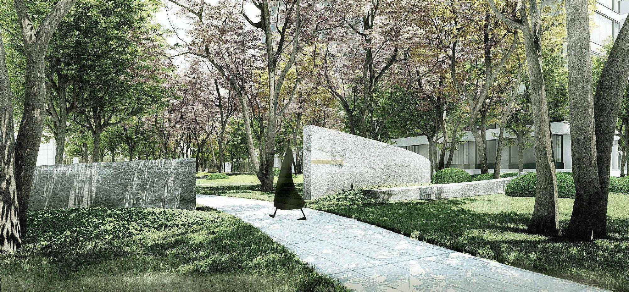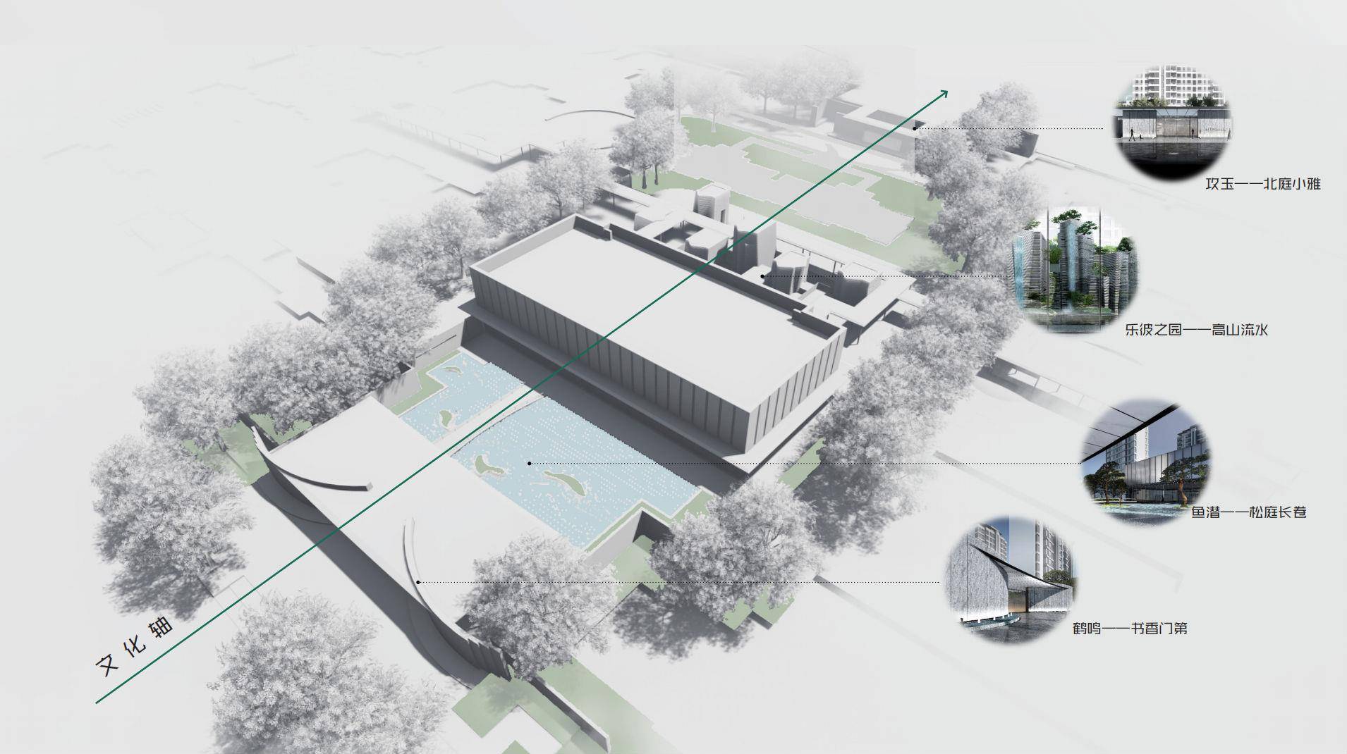 归家动线各个功能节点都被有节奏地串联,如书卷式展开的大门、象征“七圣贤”的古松、取意华山的“山水盒子”,归家礼序层层递进,移步换景。
