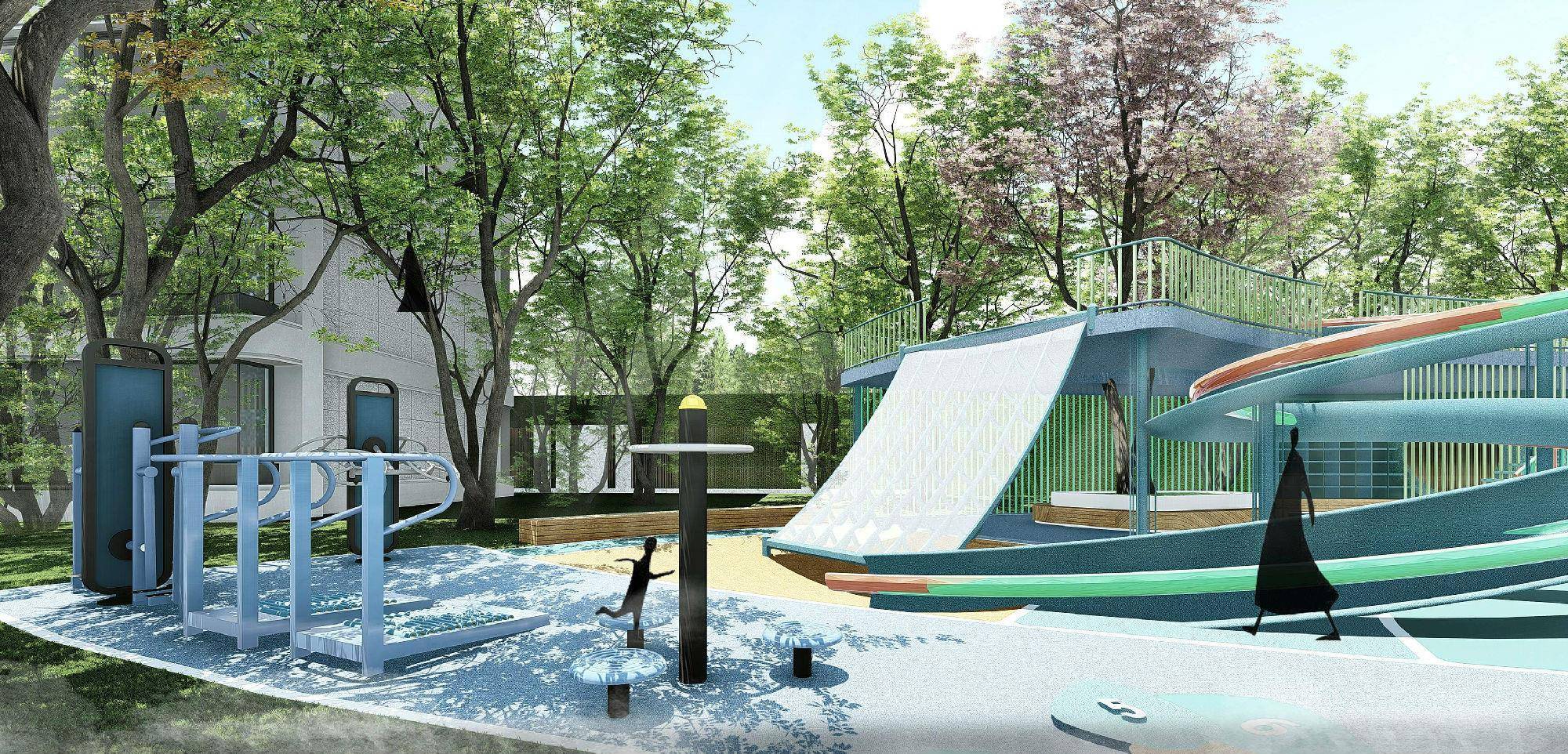 以此为主线串联起其他景观结构,诸如多功能活动区,实现了环道对全园功能的连接,同时增加了运动场地的立体维度。